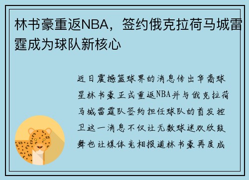 近日,震撼篮球界的消息传出:华裔球星林书豪正式重返NBA,并与俄克拉荷马城雷霆队签约,担任球队的首发控卫。这一消息不仅让无数球迷欢欣鼓舞,也让媒体竞相报道,林书豪再度成为全球瞩目的焦点。